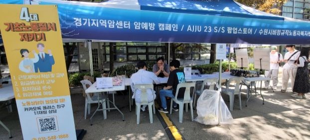 수원시비정규직노동자복지센터 직원들은 아주대 성호관 앞에서 4대 기초노동질서를 주제로 ‘노동법 O,X’ 퀴즈 행사를 진행하고, 참여자에게 노동수첩과 음료 모바일쿠폰을 증정했다. 또 4대 기초노동질서를 지키는 ‘일자리 착한가게’를 모집하고 홍보했다.