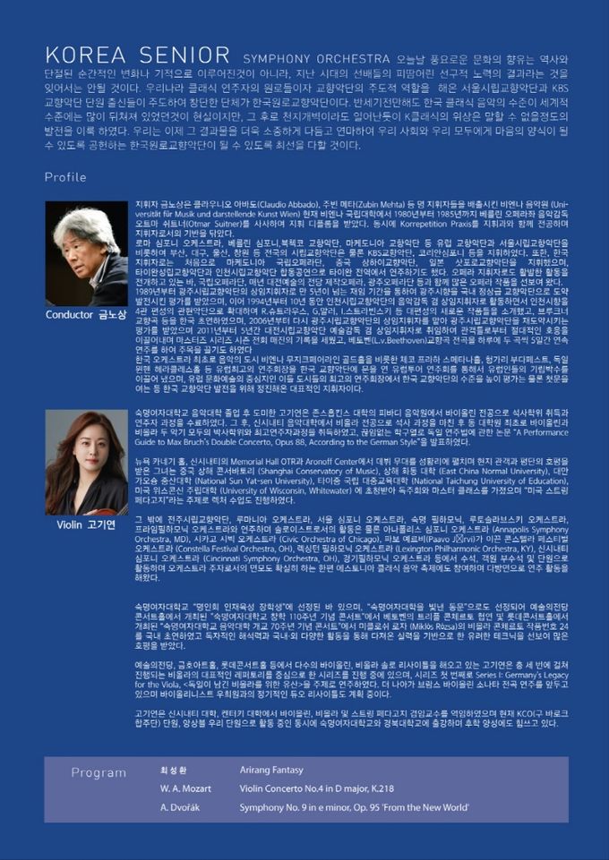 프로그램은 북한 작곡가 최성환의 아리랑 판타지(Arirang Fantasy), 모차르트 바이얼린 협주곡 제 4번 K.218, 드보르작 신세계 교향곡 제 9번이다. 지휘는 지난 달 독일 베를린 심포니로부터 초청받아 지휘하고 귀국한 한국을 대표하는 금노상 지휘자다.
