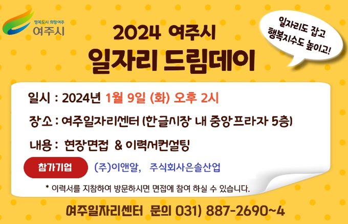 2024년 첫 일자리드림데이 참여를 원하는 구직자는 1월 9일 오후 2시까지 여주 일자리센터(중앙프라자 5층)로 방문하여 1:1 현장 면접 응시 기회와 이력서 컨설팅을 받으면 된다.