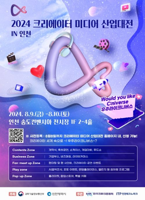 (플러스인뉴스) 과학기술정보통신부는 국내 창작자 미디어 산업의 대표 행사인'2024 크리에이터 미디어 산업대전 in 인천'을 8월 9일~10일 이틀간 인천 송도컨벤시아에서 개최한다.