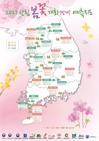 (플러스인뉴스) 산림청은 꽃샘추위가 시작되고 봄의 문턱에 들어섬에 따라 나들이를 준비하는 국민들에게 도움이 되고자 우리나라 주요 산림의 2023년 봄꽃 개화 예측지도를 3일 발표했다.