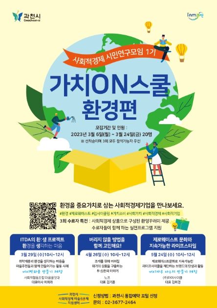 (플러스인뉴스) 과천시는 7일, 환경 문제를 주제로 한 시민연구모임 ‘가치ON스쿨 1기’를 오는 24일까지 모집한다고 밝혔다.
