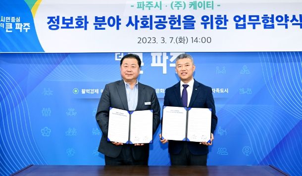 (플러스인뉴스) 파주시와 ㈜케이티는 7일 파주시청 접견실에서, 사회적 공헌을 위한 업무 협약을 체결했다고 밝혔다.