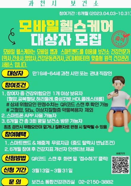 과천시보건소 관계자는 “모바일헬스사업은 손쉽게 전문가의 건강상담을 받을 수 있는 유익한 사업으로, 평소 보건소 이용이 어려운 직장인들도 비대면으로 보건사업에 참여할 수 있으니 시민들의 많은 관심과 참여를 바란다”고 말했다.