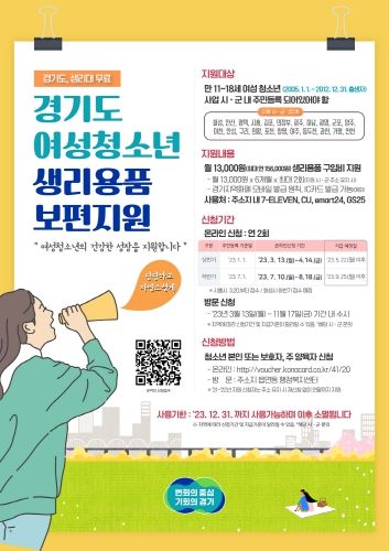 (플러스인뉴스) 경기도가 여성청소년에게 1인당 월 1만 3천 원의 생리용품 구입비를 지원하는 ‘2023년 여성청소년 생리용품 보편 지원사업’ 신청접수를 13일부터 시작한다.