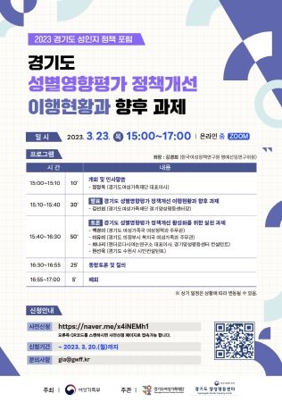 이번 포럼은 경기도 성별영향평가의 정책개선 현황을 살펴보고, 적극적인 정책개선 활성화 방안을 모색하기 위해 마련됐다. 사전신청 기간은 3월 20일까지로, 포스터 QR코드(https://bit.ly/3YpZIUn)를 통해 신청하면 누구나 온라인 줌으로 참석할 수 있다.