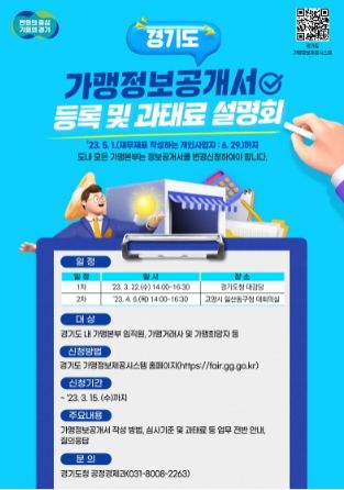 (플러스인뉴스) 경기도가 가맹본부의 가맹정보공개서 정기 변경 의무기한인 5월 1일을 앞두고 등록에 어려움을 겪는 가맹본부와 신규 본부 창업희망자를 위해 오는 22일 경기도청 신청사, 다음 달 6일 고양시 일산동구청에서 ‘정보공개서 등록 및 과태료 설명회’를 연다.