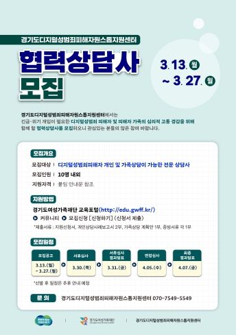 선정된 협력 상담사에게는 디지털성범죄상담을 위한 기본교육 및 보충 교육이 제공되며, 4월부터 12월까지 피해자접수 시 협력 상담사에게 사례가 배정된다. 상담은 경기도디지털성범죄피해자원스톱지원센터 내 상담실에서 진행되며, 피해자 접근성을 고려해 경기도 전역에 찾아가는 상담 서비스도 제공한다. 경기도디지털성범죄피해자원스톱지원센터는 ‘심리치유 지원 서비스’ 외에도 ‘법률 구조’, ‘심리치료(의료지원)’ 등도 제공하고 있다.