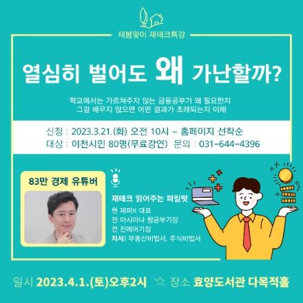 (플러스인뉴스) 이천시 효양도서관은 새봄맞이 재테크 강연으로 83만 경제 유튜버 '재테크 읽어주는 파일럿'을 초청하여 오는 4월 1일 토요일 오후 2시에 “열심히 벌어도 왜 가난할까?”를 주제로 특강을 진행한다.