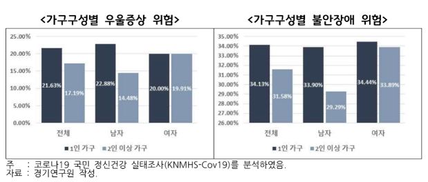 가구 구성원별로는 1인 가구일 경우 위험이 더욱 커졌는데, 우울 증상 유병률은 21.6%, 2인 이상 가구일 경우 17.2%로 그 격차는 4.4%P였다. 특히 남성의 경우 2인 이상 가구일 때 14.5%인데, 1인 가구이면 22.9%로 증가해 그 격차는 1.6배에 달했다. ‘코로나19 팬데믹으로 인해 자살 생각’을 한 비율은 1인 가구가 13.5%로 분석돼 2인 이상 가구(7.7%)와의 격차는 1.8배였다.