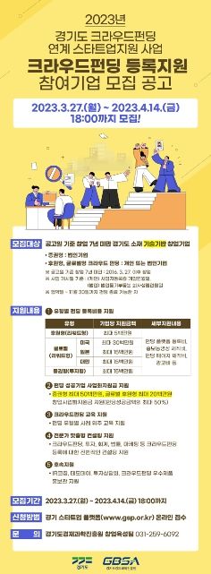 (플러스인뉴스) 경기도와 경기도경제과학진흥원은 도내 새싹기업(스타트업)의 민간 투자유치 확대를 지원하기 위해 ‘2023 크라우드펀딩 연계 스타트업 지원사업’을 추진한다고 27일 밝혔다.