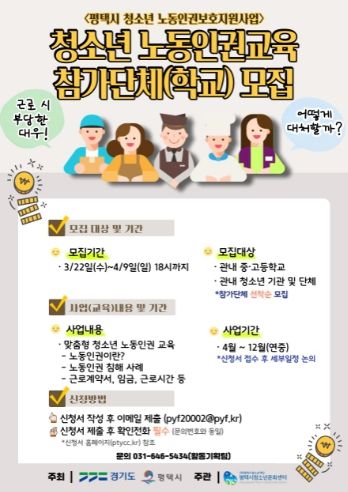 (플러스인뉴스) 평택시가 (재)평택시청소년재단에 위탁 운영하고 있는 평택시청소년문화센터(센터장 곽지숙)에서 ‘청소년 노동인권교육’에 참여할 청소년 단체 및 학교를 모집한다.