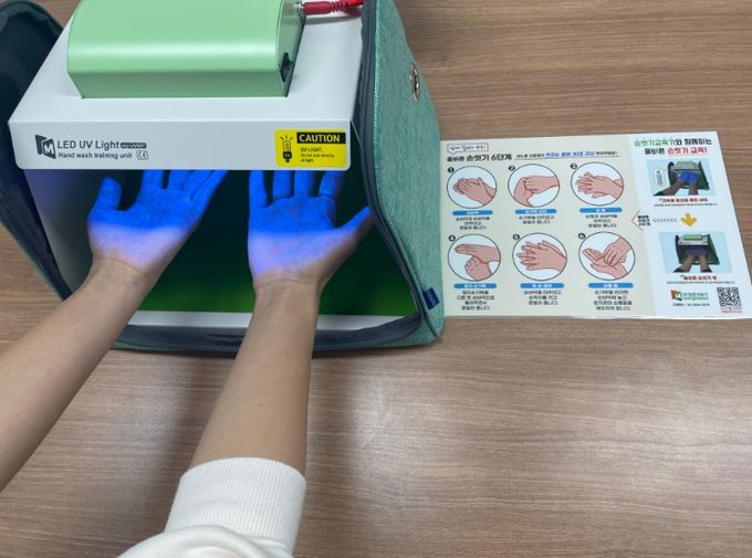 과천시보건소에서 대여하는 손 씻기 교육장비는 손에 형광 로션을 바르고 손 씻기 전과 후의 청결 상태를 비교하여 손 씻기 효과를 체험할 수 있는 기자재로 아이들이 올바른 손씻기 방법을 자연스럽게 습득할 수 있도록 도와준다.
