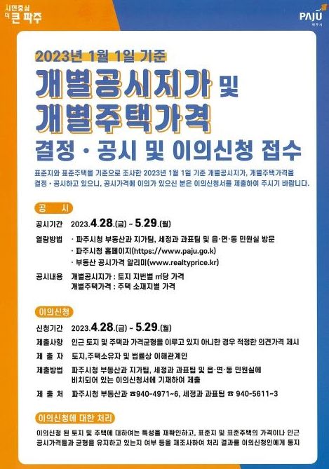 한편 국토교통부에서 결정·공시하는 파주시 관내 공동주택 2,100단지의 14만6,845호도 같은 방법으로 가격 확인 및 이의신청이 가능하며, 파주시로 제출된 이의신청은 한국부동산원으로 이첩되어 처리된다. 자세한 사항은 세정과로 문의하면 된다.