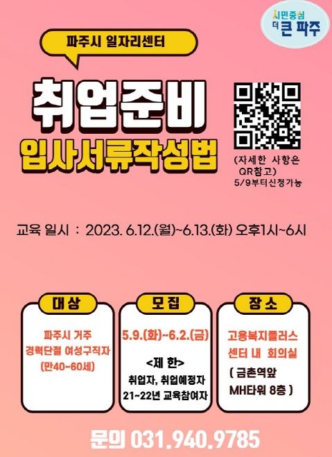 이번 프로그램은 파주시 거주 만 40~60세의 미취업 여성을 대상으로, 6월 12일과 13일 오후 1시부터 6시까지 파주고용복지플러스센터에서 진행된다.