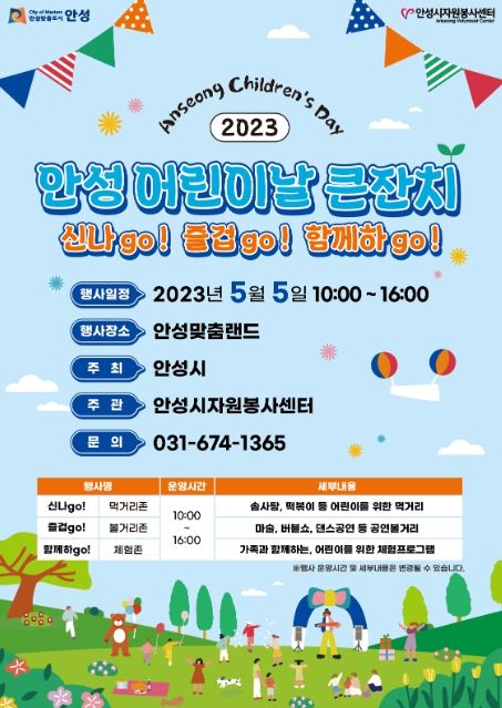 (플러스인뉴스) 안성시는 올해 어린이날을 맞이하여 5월 5일 금요일 안성맞춤랜드에서 “2023년 안성시 어린이날 큰잔치 '신나go! 즐겁go! 함께하go!'를 개최한다고 밝혔다.