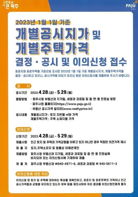 (플러스인뉴스) 파주시는 2023년 1월 1일 기준 개별공시지가를 4월 28일 결정‧공시하고 5월 30일까지 이의신청을 받는다.