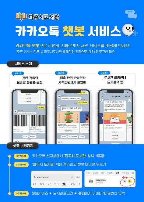 서비스는 시민 누구나 이용할 수 있으며, '카카오톡' 앱에서 '파주시 도서관'을 검색한 후 채널을 추가한 뒤, 채팅하기 아이콘을 클릭하면 된다. 최초 1회 로그인 후에는 추가 로그인 없이 모바일 회원증을 쉽게 사용할 수 있다.