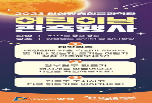 (플러스인뉴스) 안성시는 어린이날을 맞이하여 안성맞춤랜드 내 잔디광장에서 오는 5월 5일에 ‘천문과학관 어린이날 무료 태양관측행사’를 운영한다고 밝혔다.