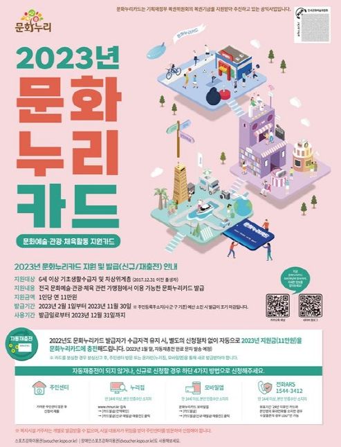 문화누리카드는 각 읍면동 행정복지센터, 누리집, 모바일 앱 등을 통해 11월 30일까지 발급 가능하며, 12월 31일까지 사용하지 않으면 자동 소멸된다.