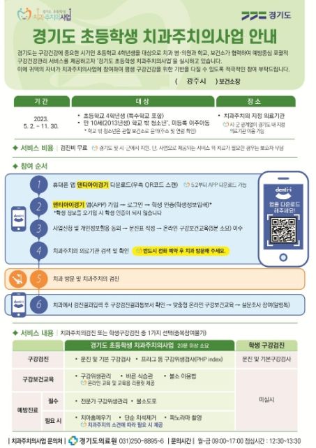 이용방법은 ‘덴티아이경기’앱에 가입해 사전 문진표 등을 작성하고 온라인 구강보건교육(전문가 위생관리, 불소도포) 과정을 이수한 후 관내 치과주치의 지정의료기관에 전화 예약 후 방문하면 된다.