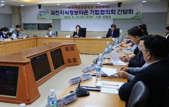 (플러스인뉴스) 과천시는 21일 시청 상황실에서 신계용 과천시장과 엄주범 대표회장을 비롯, 과천지식정보타운 기업협의회 입주기업 대표 및 임직원 등이 참석한 가운데 간담회를 개최했다.