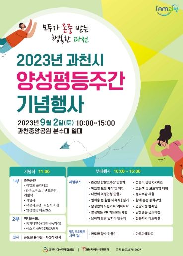 (플러스인뉴스) 과천시가 양성평등주간(9.1~9.7)을 맞이하여 ‘모두가 존중받는, 행복한 과천’이라는 슬로건으로 9월 2일 중앙공원 분수대 일원에서 기념행사를 연다.