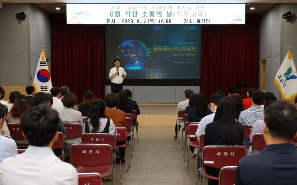 (플러스인뉴스) 과천시는 지난 7일 시청 대강당에서 열린 ‘직원 소통의 날’에 서울대학교 푸드테크학과 학과장이자 푸드테크협의회 공동회장인 이기원 교수를 초청하여, ‘푸드테크의 정의와 미래비전’이라는 주제로 전직원 대상 강의를 개최했다.