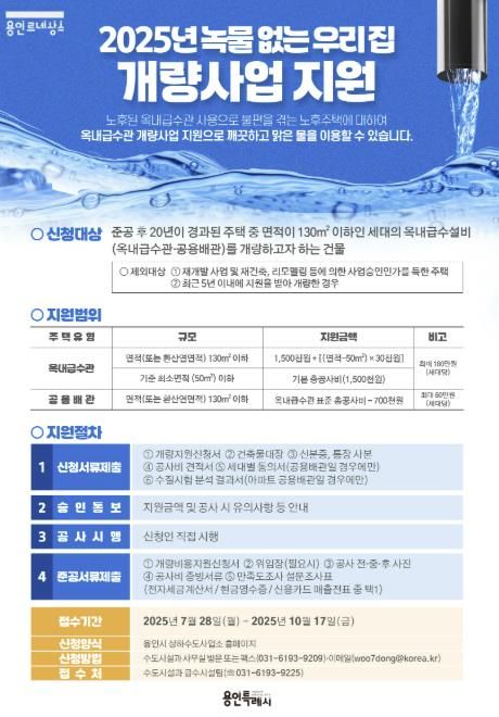 (플러스인뉴스) 용인특례시는 ‘녹물 없는 우리 집 수도관 개량사업’ 참여 가구를 추가로 모집한다고 18일 밝혔다.