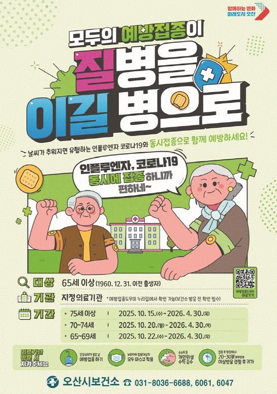 이권재 오산시장은 “독감과 코로나19 예방접종은 대상자별 접종 시작일에 맞추어 지정 의료기관을 방문해야 한다”며 “적기에 접종해 미리 예방하는 것이 가장 중요하다”고 당부했다.