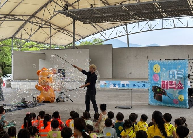 공연은 곤지암 도자공원 야외공연장에서 1일 2회, 총 6회에 걸쳐 진행됐으며 프로그램은 ▲손 씻기 6단계 및 양치 333 법칙 알아보기 ▲핸드버블쇼·멀티 버블쇼·LED 테이블 버블쇼 등 시각적 요소 활용 ▲대형 비눗방울 체험 참여 등 다양한 활동으로 구성돼 교육 효과를 높였다.