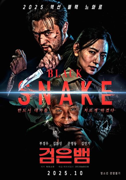 (플러스인뉴스) 10월 개봉을 확정한 영화 '검은뱀'이 2025년을 사로잡은 고자극 액션 영화의 계보를 이을 기대작으로 주목받는다.[감독 : 박도환 | 출연 : 부정우, 김화인, 문영동, 김민기, 기주봉 외 | 제작 : 케이스타 | 배급 : ㈜이놀미디어 | 등급 : 청소년관람불가]