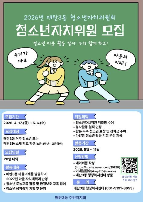 (플러스인뉴스) 수원시 영통구 매탄3동은 매탄3동 주민자치회가 지역 청소년의 참여를 확대하고, 향후 지역사회를 이끌어 나갈 역량을 기르기 위해 2026년 청소년자치위원회 위원을 모집한다고 밝혔다.