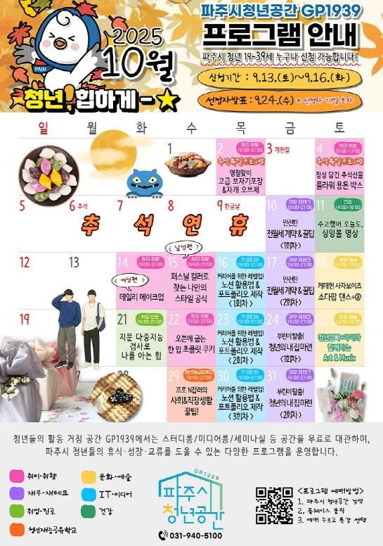 특히 10월에는 ‘청년, 힙하게’를 주제로 청년들이 자신의 개성과 감각을 찾고 표현할 수 있는 프로그램들로 주로 구성됐다. 이 외에도 추석을 기념하는 ‘추석 특별 프로그램’, 청년 연령 확대에 따라 마련된 ‘청년 엄마(혹은 아빠)와 아이와 함께하는 프로그램’, 세계적 인기를 끌고 있는 만화 영화 ‘케이팝 데몬 헌터스’ 오에스티(OST) 안무 수업 등 다채로운 프로그램이 준비되어 있다.