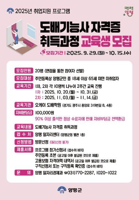 교육은 10월 20일부터 11월 14일까지 진행되며, 자세한 내용은 양평군 누리집 공고문에서 확인할 수 있고, 양평군청 일자리경제과로 문의하면 된다.