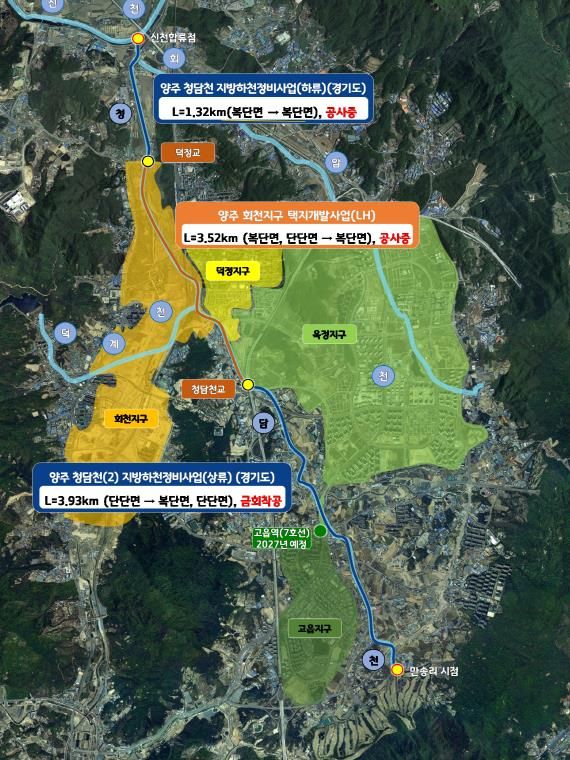 정비사업은 양주시 만송동에서 고암동에 이르는 청담천 일원 총 연장 3.93km 구간의 하천을 정비하는 것으로 ▲축제공(제방 쌓기) 5.0km ▲보축(제방 보수·보강)5.0km ▲교량 2개소 설치 등이 포함된다.