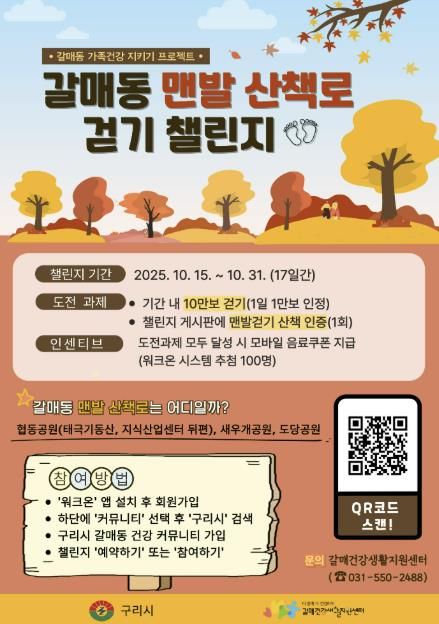 참여 방법은 모바일 앱 ‘워크온(WalkOn)’을 통해 ‘갈매동 커뮤니티’에 가입 후 챌린지 참여를 신청하면 된다. 참가자는 기간 내 두 가지 과제를 수행해야 하며, ① 총 10만 보 걷기(하루 최대 1만 보 인정),② 맨발 산책로 걷기 사진을 게시판에 공유하는 과제를 완료하면 된다.