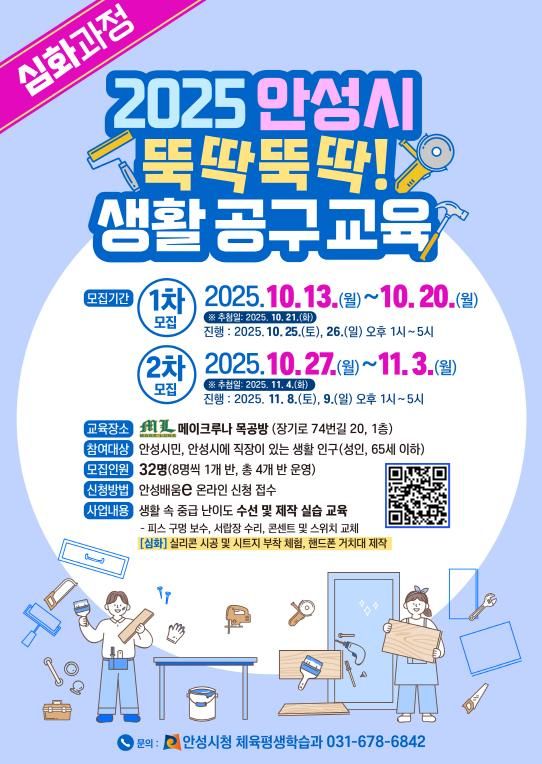 (플러스인뉴스) 안성시는 시민들의 생활 자립 역량 강화를 위해 '뚝딱뚝딱 생활 공구[심화과정] 교육'을 오는 10월 25~26일과 11월 8~9일, 총 2회 주말 일정으로 운영한다고 밝혔다.
