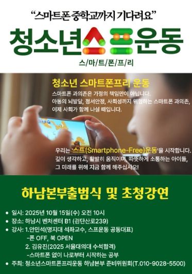(플러스인뉴스) 15일 오전 10시, 하남시 벤처센터에서 ‘청소년 스마트폰 프리 운동(Smartphone-Free)’ 하남본부 출범식을 갖는다.