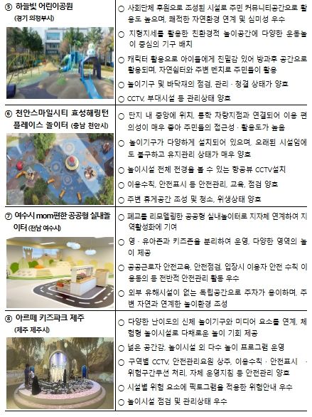 올해에는 전국 8만 4천여 개의 어린이놀이시설 중 시도 및 시도 교육청에서 추천한 46개 시설을 대상으로, 전문가·현장 심사*를 거쳐 최종 8곳을 선정했다.