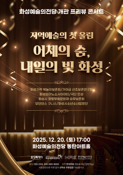 (플러스인뉴스) 화성시가 새로운 문화예술의 중심지로 조성한 화성예술의전당이 개관을 앞두고 오는 12월 20일 동탄아트홀에서 프리뷰 콘서트 ‘지역예술의 첫 울림, 어제의 숨 · 내일의 빛’을 개최한다. 이번 공연은 화성 지역 예술의 과거와 현재, 그리고 미래 비전을 한 무대에 담아내는 스토리텔링 기반 멀티장르 퍼포먼스로 구성된다.