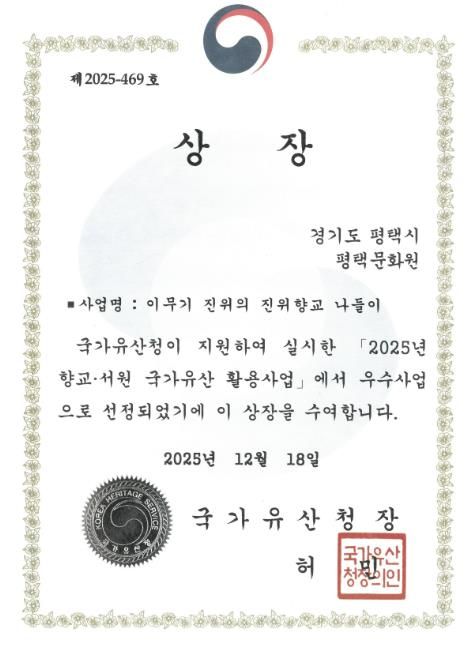 (플러스인뉴스) 평택문화원은 12월 18일 대전 전통나래관 다목적강당에서 열린 국가유산청 주최 ‘2025 우리고장 국가유산 활용 우수사업 시상식’에서 평택문화원의 ‘이무기 진위의 진위향교 나들이’가 우수사업(국가유산청장상)으로 수상했다.