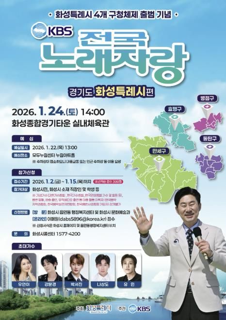 (플러스인뉴스) 화성특례시는 다음 달 2일부터 15일까지 ‘KBS 전국노래자랑’ 화성특례시편 참가자를 모집한다고 24일 밝혔다.