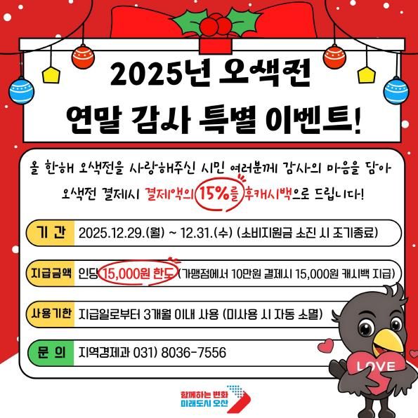 (플러스인뉴스) 오산시는 한 해 동안 지역화폐를 이용해 준 시민들에게 감사의 뜻을 전하고, 연말 소비 활성화를 도모하기 위해 ‘2025년 오색전 연말 감사 특별 이벤트’를 추진한다.
