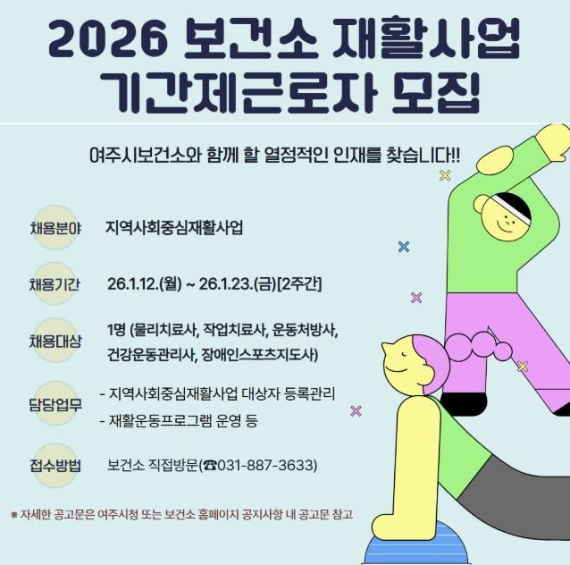 (플러스인뉴스) 여주시보건소는 지역 내 등록장애인과 예비장애인들의 건강관리를 위한 지역사회중심재활사업 추진을 위해 1월 12일부터 1월 23일까지 2주간 기간제근로자 채용 공고를 실시한다.
