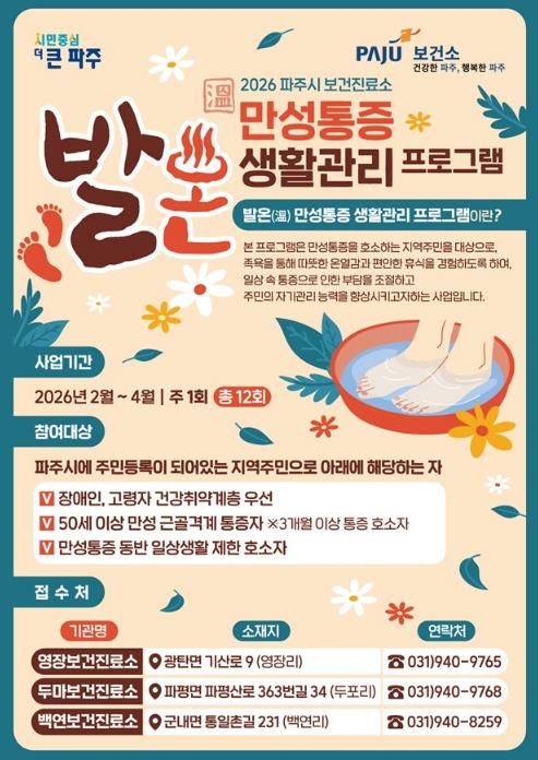 (플러스인뉴스) 파주시 보건진료소는 보건의료 취약지역 주민들의 건강증진을 위해 2026년 ‘발온(溫) 만성통증 생활관리’교실을 운영한다.