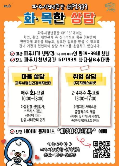 (플러스인뉴스) 파주시는 청년들의 심리 안정과 취업 역량 강화를 위해 파주시청년공간 지피(GP)1939에서 진행하는 상담 프로그램 ‘화·목한 상담’의 참여자를 모집한다.