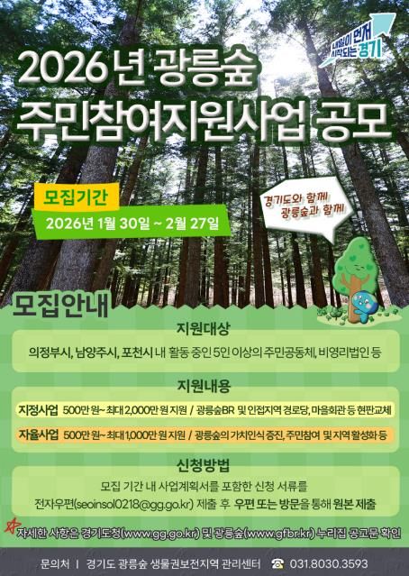 (플러스인뉴스) 경기도가 광릉숲 생물권보전지역 활성화를 위해 2026년 광릉숲 주민참여지원사업 참여자를 모집한다.