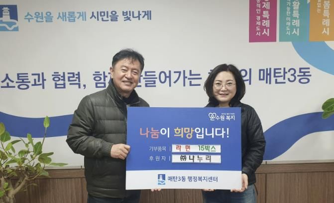 (플러스인뉴스) 수원시 영통구 매탄3동 행정복지센터는 지난 6일, 관내 폐기물 수거업체인 ㈜나누리로부터 설 명절을 맞아 어려운 이웃을 위한 라면 15박스를 기탁받았다고 밝혔다.