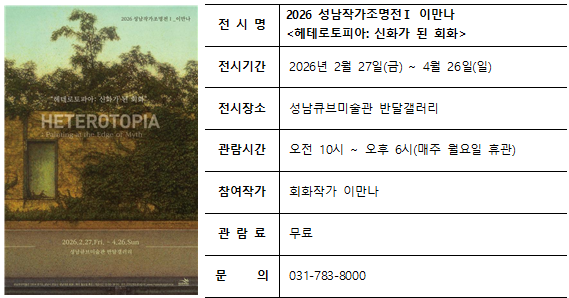 성남문화재단(대표이사 윤정국)은 지역의 역량 있는 작가들의 작품 세계를 집중 조명하는 기획전 2026 성남작가조명전의 첫 번째 전시로 ‘헤테로토피아: 신화가 된 회화’를 오는 2월 27일(금)부터 4월 26일(일)까지 성남큐브미술관 반달갤러리에서 개최한다.